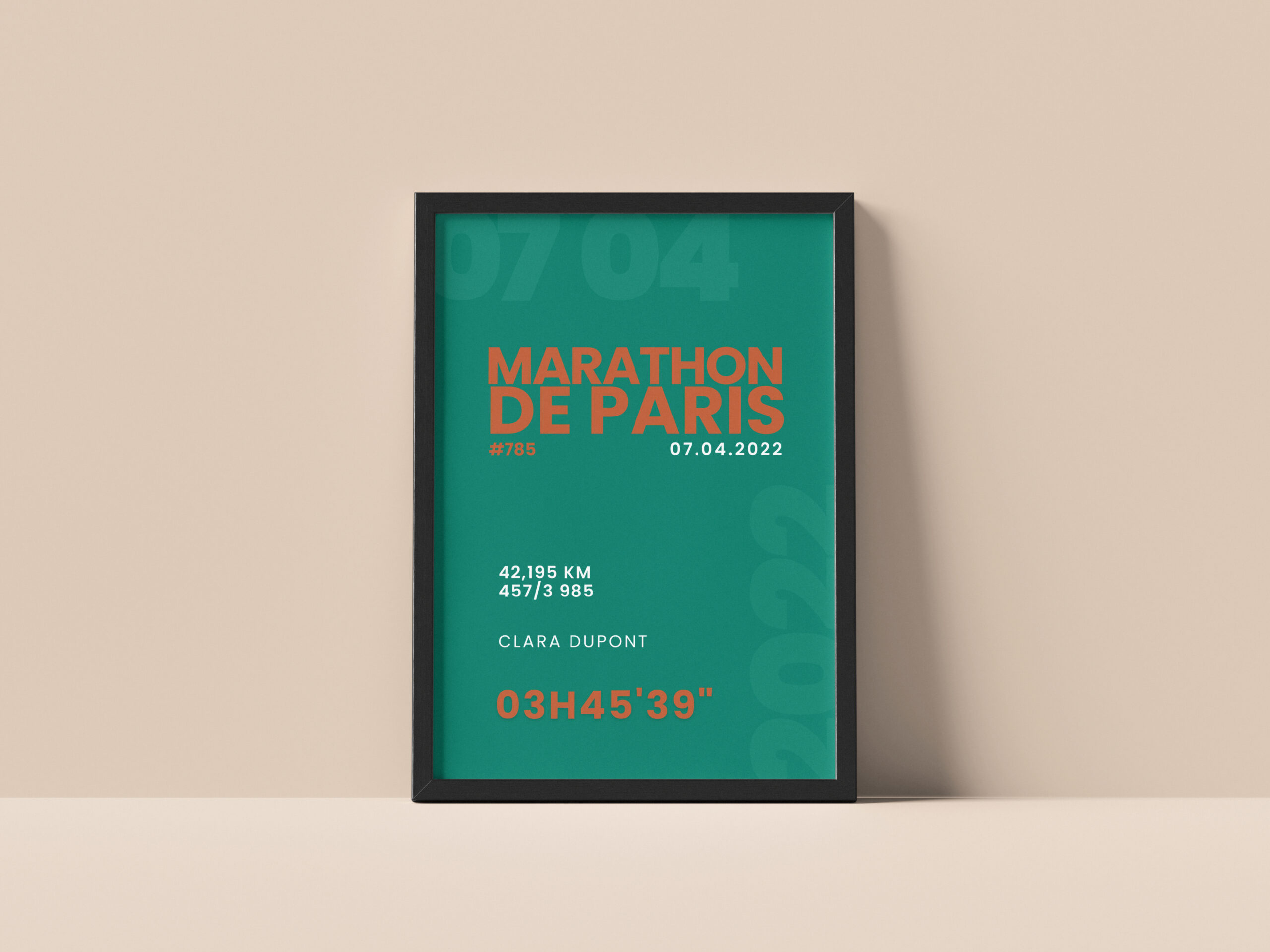 Nos créations combinent design minimaliste, détails sportifs et touches personnelles afin de transformer vos données (temps, distance, dénivelé, dossard, citation, prénom…) en un souvenir élégant à afficher fièrement chez vous ou à offrir en cadeau.